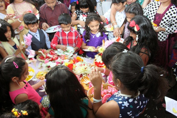 The celebration commenced with the introduction from Marina Monis Warrington. This was soon followed by the showers of flowers by the children and the adults as an offering to Infant Mary to commemorate her birthday; whilst the choir simultaneously sang the hymn "Morieak Hogolxieam".